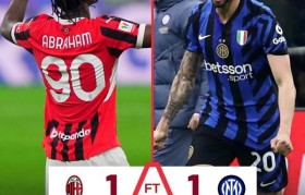 意大利杯半决赛首回合,AC米兰主场1-1国际米兰。上半场双方均无建树,下半场亚伯拉罕首开纪录,恰尔汗...