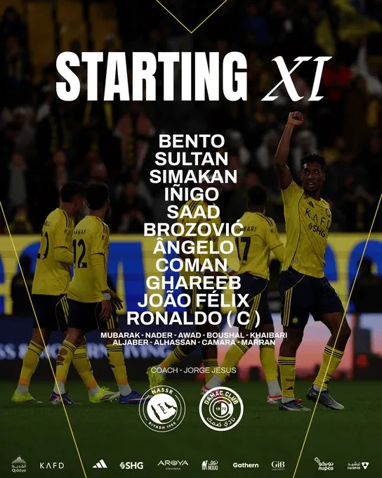 利雅得胜利首发:24-本托、3-西马坎、26-伊尼戈-马丁内斯、2-甘纳姆、96-纳赛尔、11-布罗佐维奇、21-科曼、20-安杰洛、29-加里卜、7-C罗、79-菲利克斯