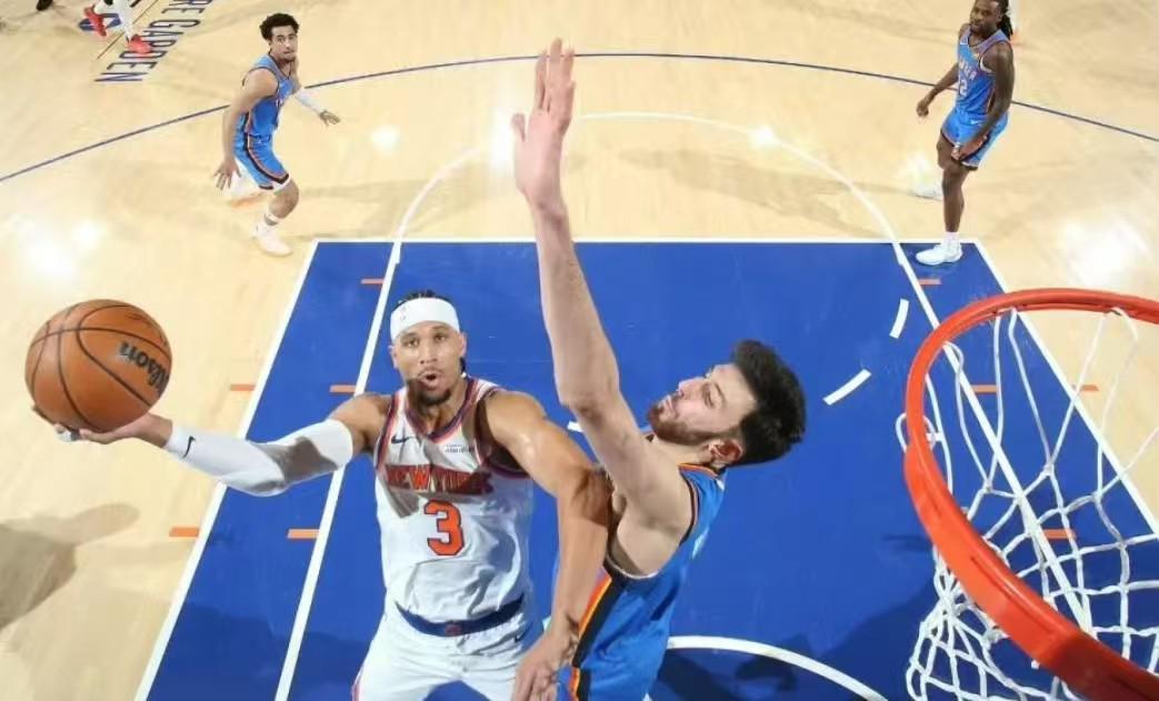 半场落后10分,尼克斯上半场的表现很糟糕,球队需要在下半场做出回应!易边再战,雷霆队霍姆格伦、亚历山大继续发力,球队把分差拉大到15分,不过这个时候,唐斯、阿奴诺比站出来为球队缩小分差,随后沙梅特成为奇兵,外线连中3分,帮助尼克斯追平比分,随后布里奇斯3分也中,尼克斯实现反超!